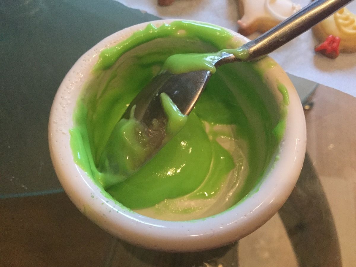 Si vous dessinez de nouveaux motifs avec la glace royale (j'ai dessiné les feuilles, les fleurs, les oreilles, les moustaches… de cette façon), réalisez une glace royale moins liquide en ajoutant moins de blancs d'oeufs au sucre glace pour obtenir la consistance d'une pâte souple mais épaisse (cf. la photo de la glace royale verte ci-dessus).