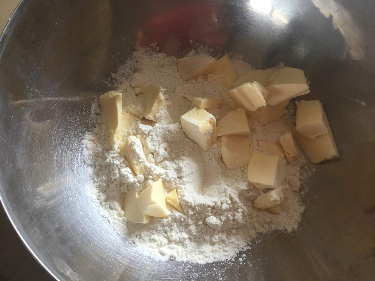 Dans un saladier, déposez ensemble la farine et le beurre découpé en morceaux. Travaillez du bout des doigts pour obtenir un mélange sableux.